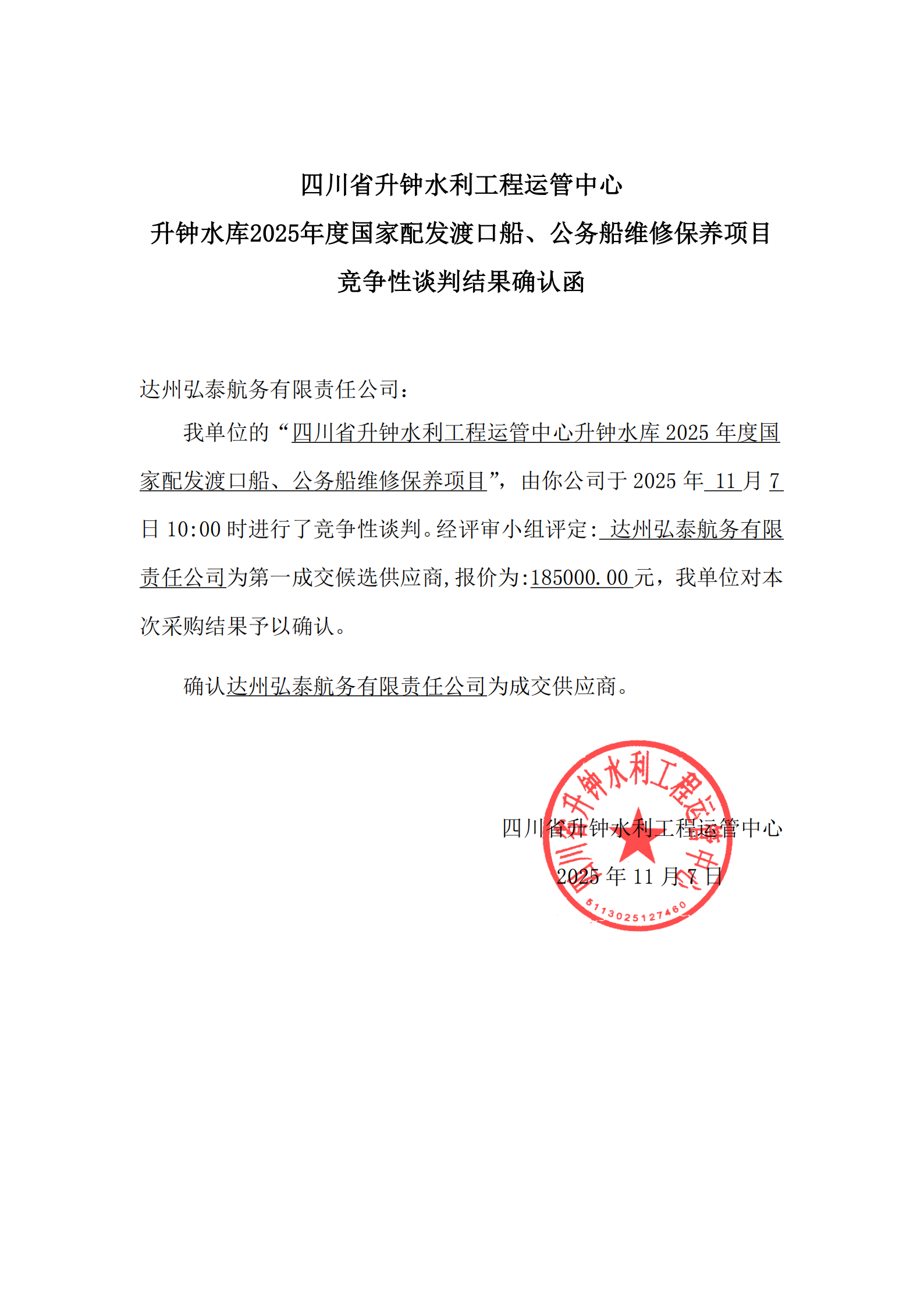 升钟水库2025年度国家配发渡口船、公务船维修保养项目竞争性谈判结果确认函