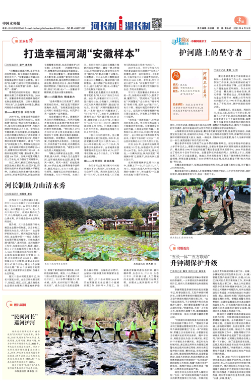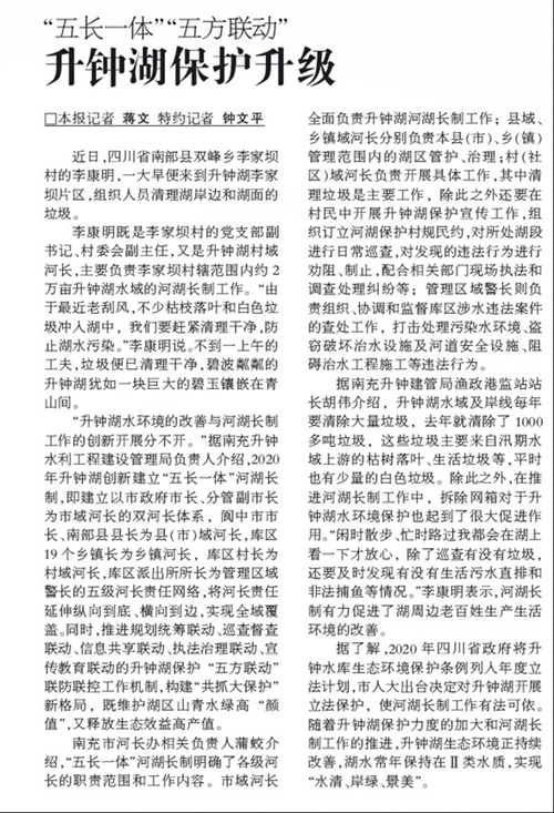 升钟湖创新“五长一体”河湖长制工作经验成效被《中国水利报》刊载于2021年4月9日第3版