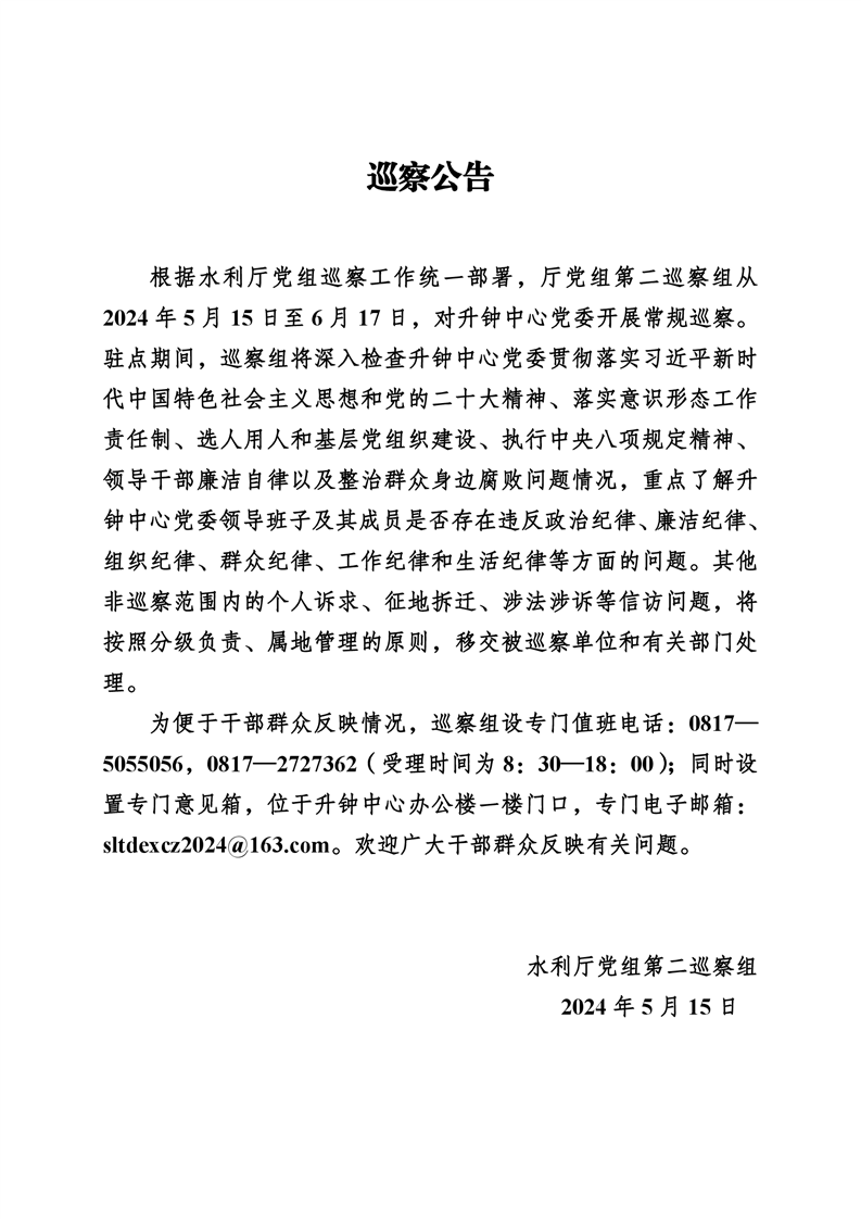时间:2024/5/15 来源:水利厅党组第二巡察组 编辑:雍波 审稿:尹恒 阅读次数:474