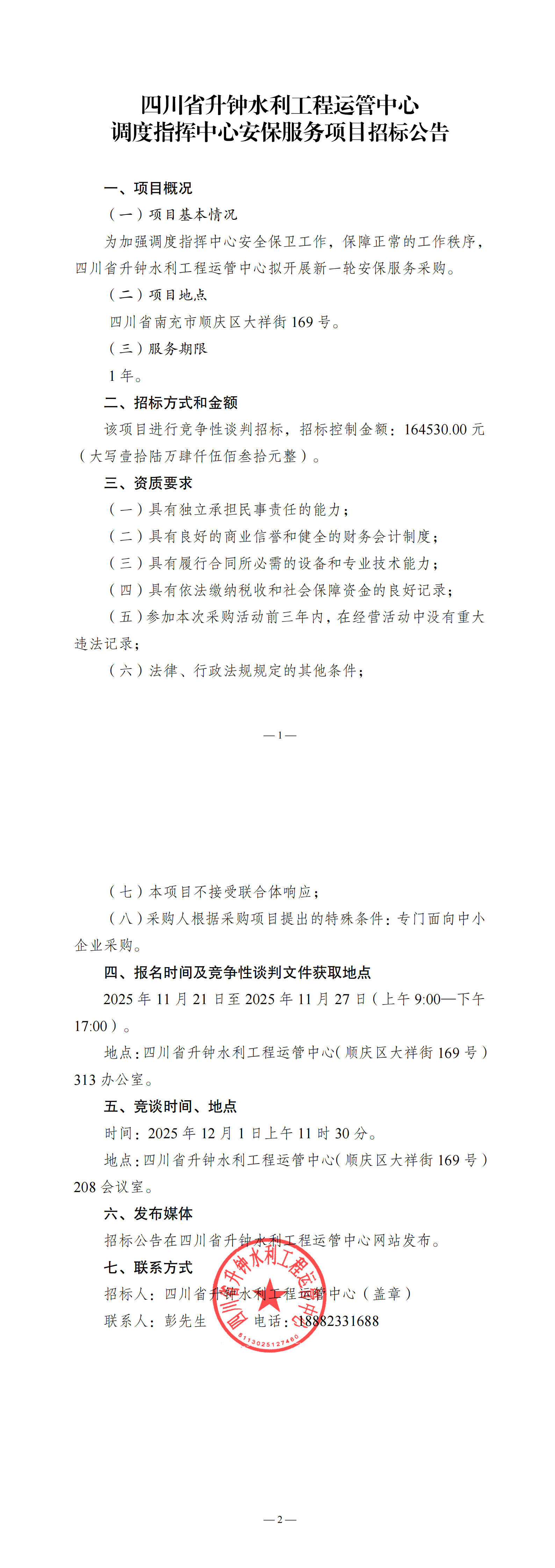 四川省升钟水利工程运管中心调度指挥中心物业管理服务招标公告