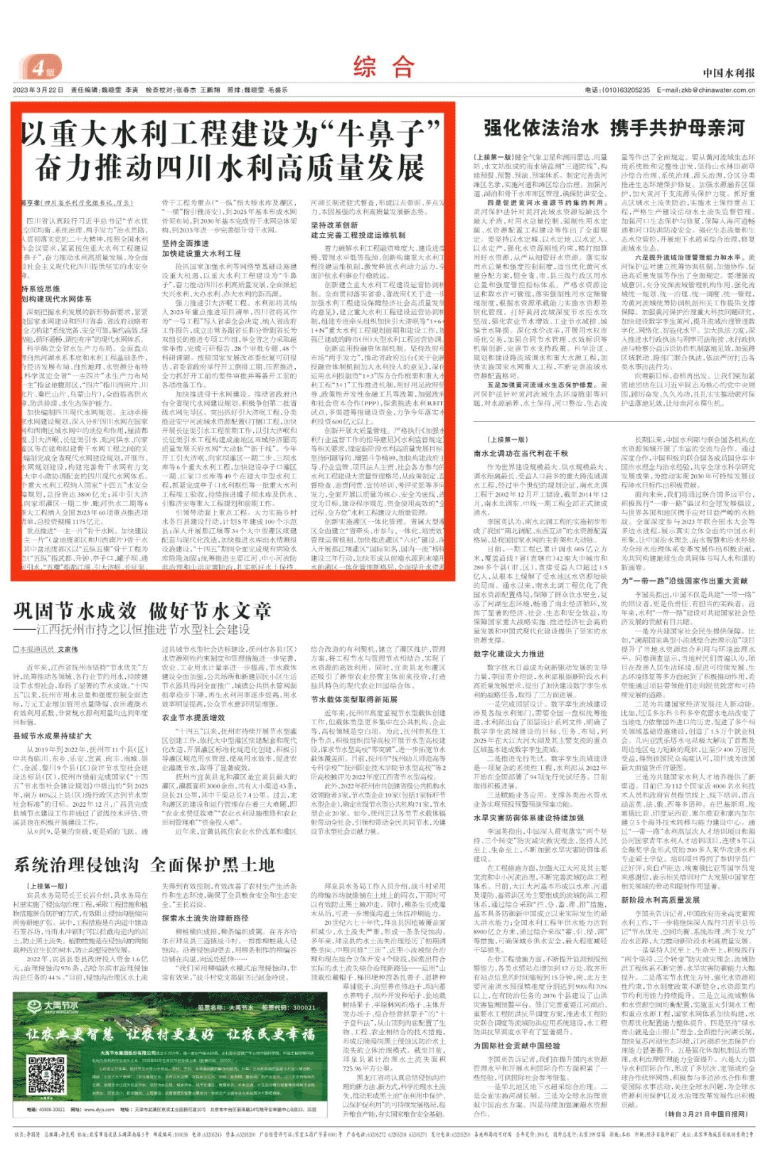3月22日,《中国水利报》刊发四川省水利厅党组书记、厅长郭亨孝署名文章《以重大水利工程建设为“牛鼻子” 奋力推动四川水利高质量发展》。以下为全文↓↓